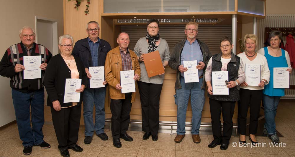 Außerdem wurden folgende langjährige Mitglieder geehrt: Ewald Scheffler, Anna-Maria Werle, Jürgen Werle, Roswitha Benzel, Sonja Simon-Dannenberg, Anette Langer, Walburga Frick, Reinhold Götten, Maria Bettinger, Hans-Jürgen Forster, Friedbert Schmitt, Karl Jacobi, Ursula Maria Samson und Gerd Lang (10 Jahre Mitgliedschaft); Klaus Dieter Fischer, Manfred Bintriem, Rosa-Maria Götten, Michael Haupenthal und Werner Luther (20 Jahre); Manfred Dannenberg und Agathe Scherer (30 Jahre); Leo Werle (40 Jahre).